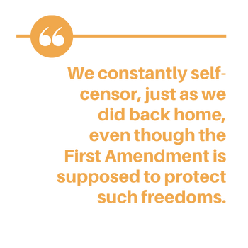 When I fled my home country, I sought freedom of speech and liberties I couldn’t have there, fearing arrest simply for holding political opinions. While no country is perfect, I came to the United States for safety and freedom. Back home, people had to delete social media apps and contacts to avoid persecution, and now in the United States, the conversation revolves around deleting your social media presence to avoid arrest or searches at airports or on the street. It feels eerily similar to the oppressive environment I fled. I see parallels between the repression I faced and what I witness in the United States today, especially the fear of expressing peaceful opinions or activism. We constantly self-censor, just as we did back home, even though the First Amendment is supposed to protect such freedoms.