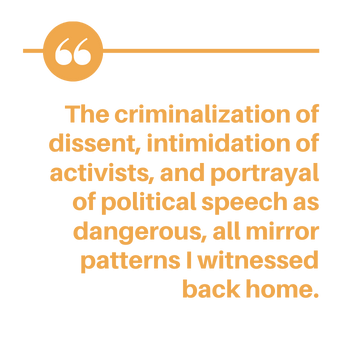 The fear I lived with back home, the constant self-censorship, the quiet surveillance, the knowledge that simply standing for justice makes you a target has followed me here in different forms. I see student protesters arrested, immigrants silenced, and pro-Palestinian voices labeled as threats. It echoes the very repression I escaped.